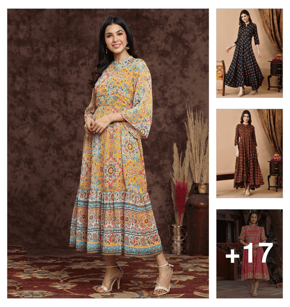 globus women blue ethnic block print mandarin collar flared hem tiered maxi fusion dress