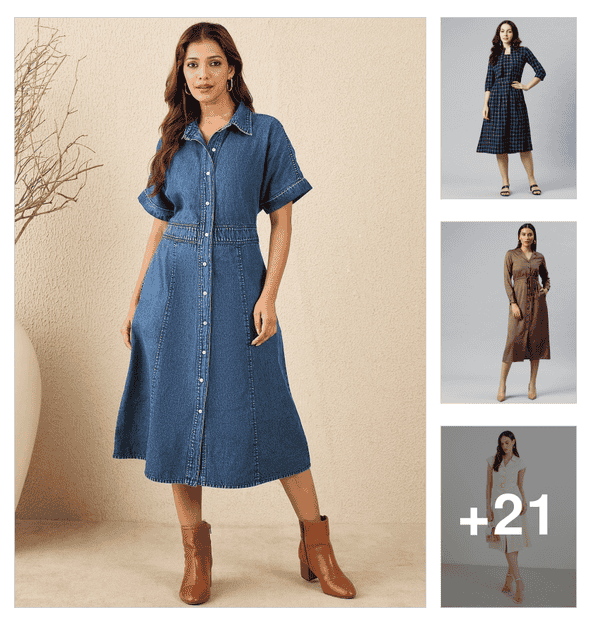 women solid collared puff sleeve denim shirt dress