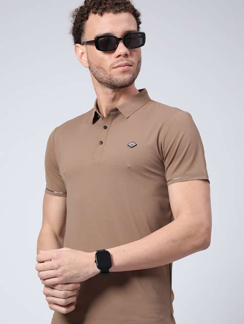 men's brown seamless polo-t-shirt with tonal stitching  slim fit breathable  stretch